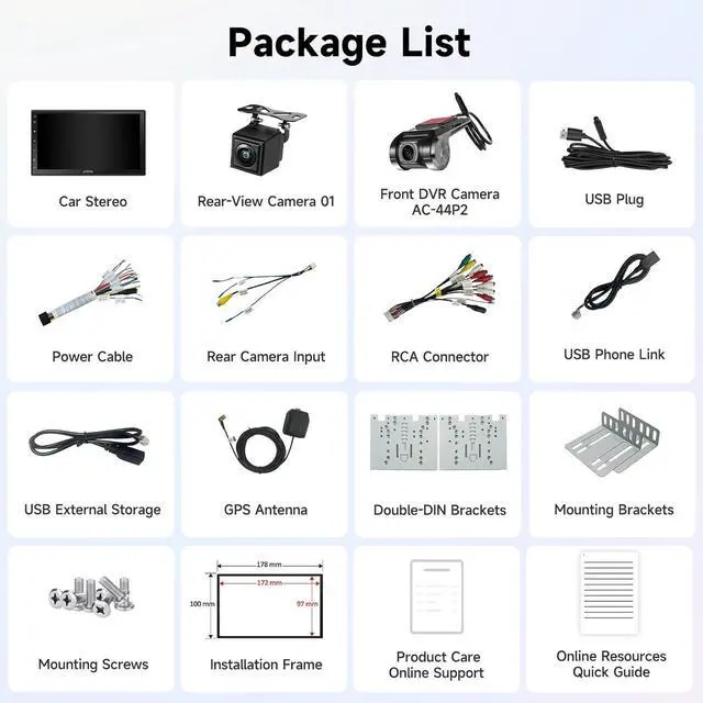 Front and Rear Dual Camera: The front DVR (AC-44P2) captures sharp 1080P with a 156° wide angle, auto/loop recording, and File protection. The rear camera (AC-HD01LR) delivers clear 720P with a 140° view, reversing guidelines, waterproofing, and night vision for all-weather reliability