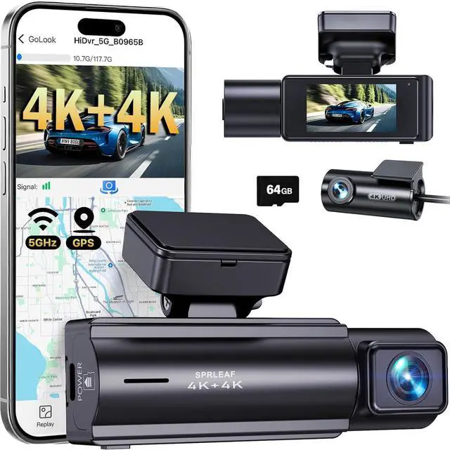 SPRLEAF Dash Cam Front and Rear, 4K+4K Dual Dash Camera for Cars, 5.8GHz WiFi GPS, Night Vision, 24-Hour Parking Mode, Included 64GB Card, 1.97 Display, WDR, G-Sensor, Loop Recording (HD13)