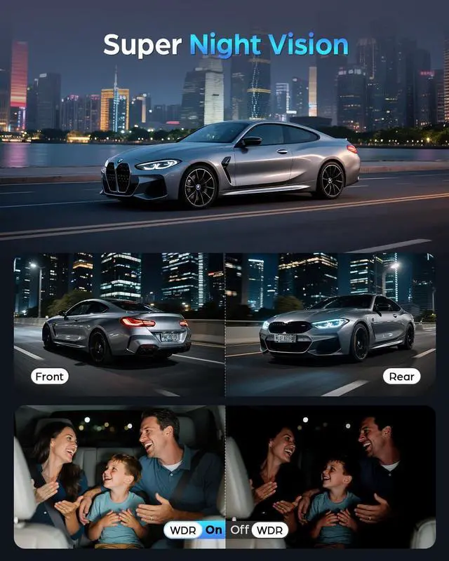 • Night Vision with WDR Technology & 1.97-Inch Display - This dash cam is equipped with WDR technology and an F1.8 aperture, enhancing its night vision capabilities for clear, detailed footage in low-light conditions. The 1.97-inch screen provides easy viewing of your recordings, ensuring you can quickly check footage and settings on the go. This dash camera for cars allows for simple operation while on the road.