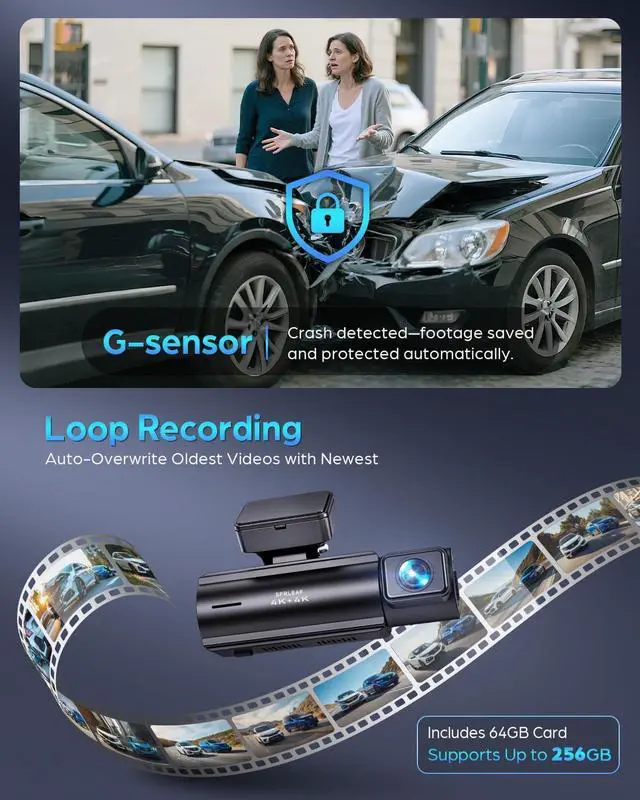 Loop Recording, G-Sensor & Free 64GB SD Card - The loop recording feature ensures uninterrupted video capture by overwriting the oldest footage when the storage is full. The built-in G-Sensor detects sudden collisions or impacts and locks the current footage to prevent it from being overwritten. A 64GB SD card is included, providing ample storage for recordings, and the dash cam supports up to 256GB for extended storage needs.