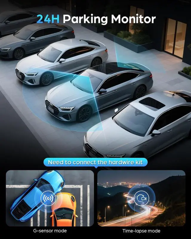 24-Hour Parking Mode - The dash cam offers two modes: Collision Detection Recording, which captures and locks footage upon detecting impacts, and Time-Lapse Recording, which condenses long parking periods into short videos to save storage space. These features provide around-the-clock protection, ensuring your vehicle and valuables are safeguarded even when you' re away. (Note: Parking monitoring requires a separate hardwire kit, NOT INCLUDED, provided upon request)