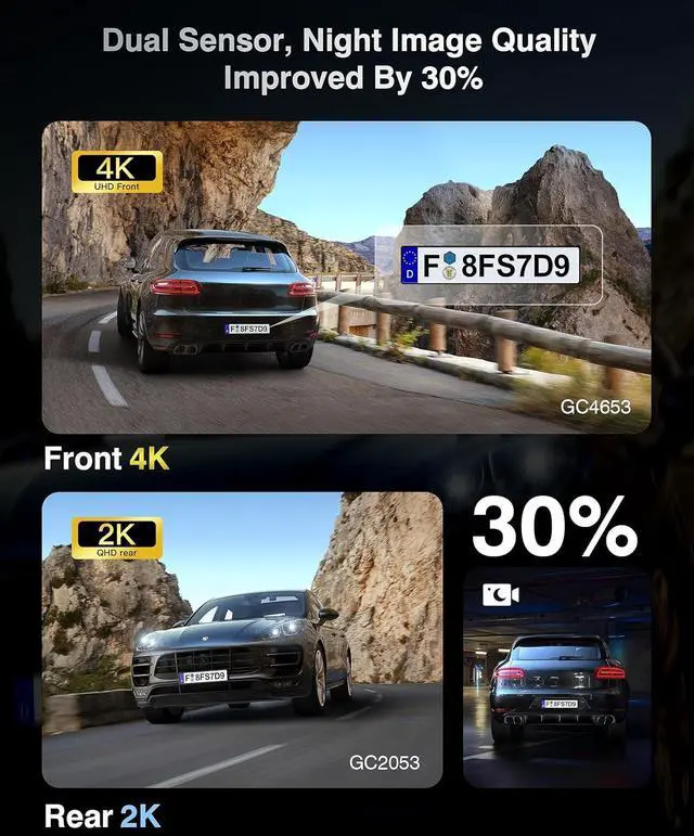 4K+2K DUAL RECORDING ULTRA SHARP AND EXTRA WIDE VIEW: Adopting f 1.5 ultra-large aperture and excellent optics, the 4K Dash Cam front and rear dual lenses are utilized to capture every detail, providing 160°wide-angle coverage for 6-lane road visibility. Enhanced WDR and sharper night vision technology ensures crystal clear images in low light or high contrast conditions (e. g. tunnels, nighttime driving), ideal for accident forensics or scenic travel.