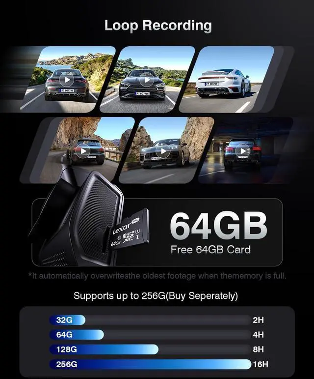 RELIABLE ACCIDENT RECORDING: Seamless recording with no lost frames or missed seconds, even in the event of a power outage; WDR technology and a 160° wide-angle lens eliminates blind spots to an even greater extent. Dash camera with loop recording function for continuous when the card is full retains and presents important evidence when the G-sensor detects a sudden collision. A 64GB memory card is included, and the car dash cam can support up to 256GB for high-capacity storage.