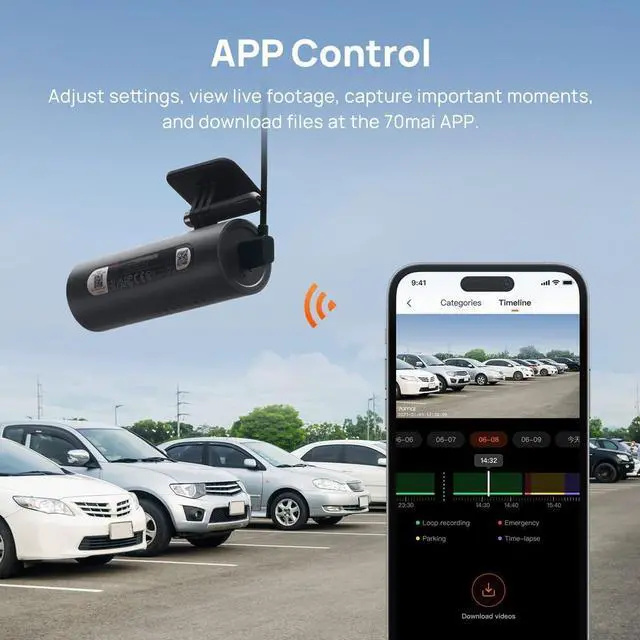 Comprehensive Protection and Evidence CaptureThe dash camera ensures 24/7 protection with advanced parking monitoring, safeguarding your vehicle even when you' re not around. The time-lapse saves storage while documenting key moments. In case of a collision, the emergency lock function secures video starting from 5s before the incident to 25s after, ensuring crucial evidence is never lost. 70mai Hardwire Kit UP03 is required, and is sold separately, ASIN: B09TDZ6FWZ)