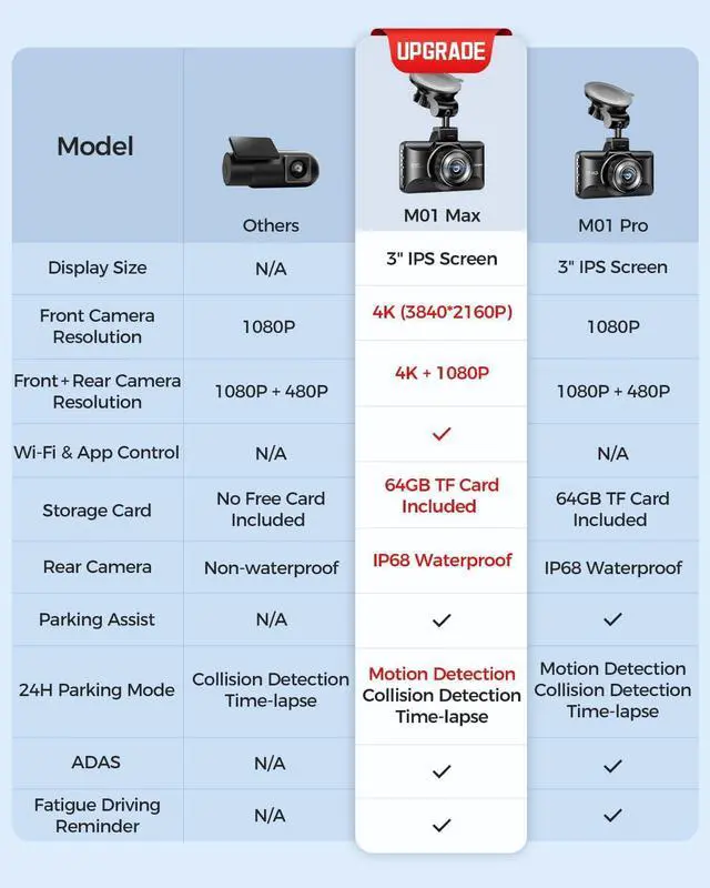 Free 64GB Card & Loop Recording: M01 Max wifi car camera won' t lose any crucial evidence with loop recording function, overwriting the oldest unprotected files when the SD card is about full.