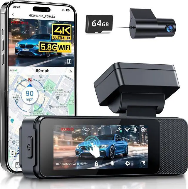 4K + 1080P Dual Recording Dash CamGKU dash cam front and rear supports Ultra HD 4K (3840×2160) front recording and 1080P Full HD rear recording. With a wide-angle design of 170° front and 150° rear, dash camera for cars minimizes blind spots, providing comprehensive front and rear coverage. Capture essential details such as license plates and road signs with outstanding clarity using this 4k dashcam.