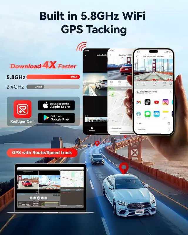 [High-Speed WIFI Connectivity & GPS Tracking] - Revolutionize your driving experience with our state-of-the-art dashcam front and rear camera, boasting 5.8GH z WiFi that offers download speeds four times faster than traditional 2.4GH z WiFi. Seamlessly control your device via the [Redtiger Cam] App, while the built-in GPS precisely tracks your route and speed. With this feature, you can quickly browse, download and share videos on your phone