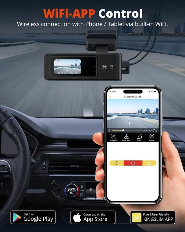 WIRELESS WiFi DASH CAM: Built-in wifi for wireless connection between dashcam and smartphone. Easy downloading/reviewing videos and changing settings on app. No more need to take the car camera off the windshield to operate