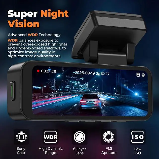 Crystal-Clear Night Recording This dash camera for cars uses advanced night vision and WDR technology to capture vivid details in the dark. Ideal for night drives, parking lots, or tunnels, it ensures your car dash cam never misses crucial moments after sunset.