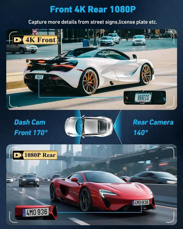 4K+1080P Dual Dash CamDual dash cams record Ultra HD 4K (3840*2160P) + FHD 1080P resolution video. The 170° front and 140° rear wide-angle dash cams ensure fewer blind spots, help you get a clear view of road signs, vehicle license plates and other road details, and provide reliable video evidence for accident disputes and insurance claims.