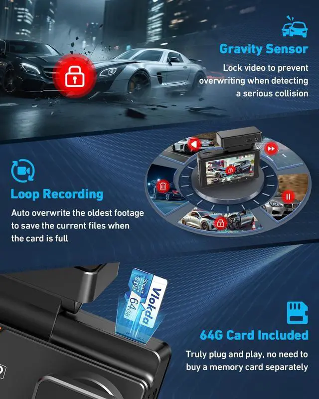 Loop Recording and Gravity SensorOur dual front and rear cameras are equipped with a 64GB memory card. When the memory card reaches its maximum capacity, the dashcam automatically deletes the oldest unlocked recordings. Meanwhile, the built-in G-sensor detects a sudden collision, dash cam for car will locks and saves the collision video, which is not overwritten during loop recording. A separate hardwire kit is required to utilize the 24-hour parking monitoring feature.