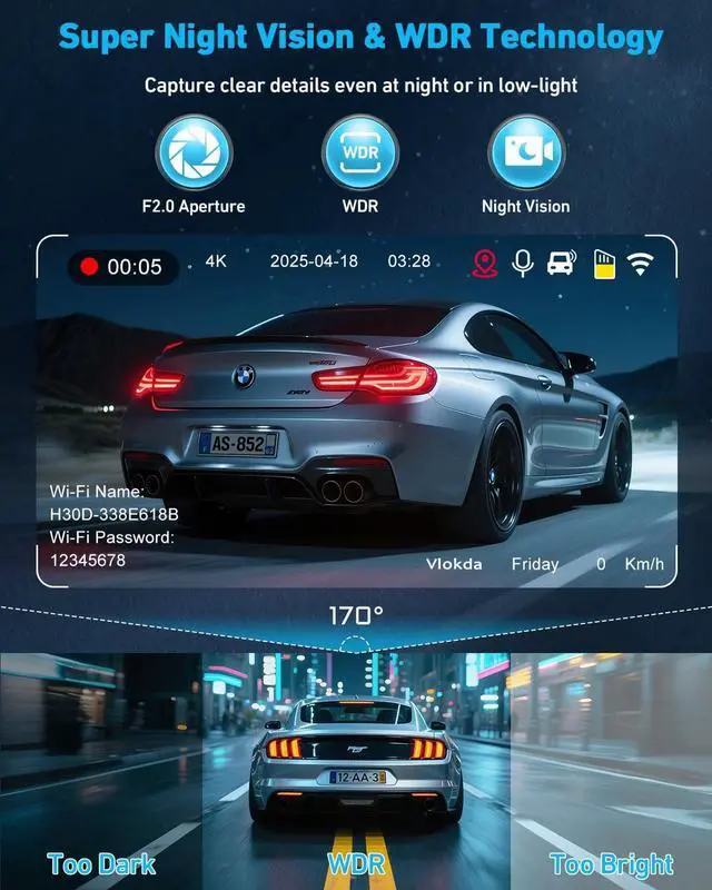 Vlokda Car Dash Camera Front and Rear Support Super AftersaleOur greatest pursuit is to satisfy the needs of consumers. Vlokda 4k dash cam is backed by full 18-MONTH Assurance and 100% Satisfaction Guarantee. Email our customer service and we will answer any questions and concerns. We offer 7*24 hours technical support