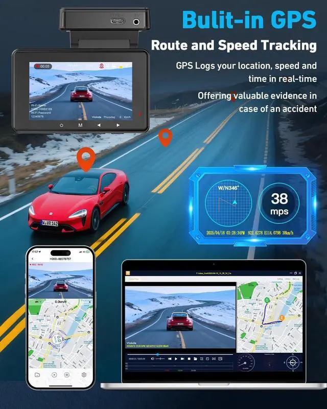 Dash Cam with GPS Dashcam with gps and speed which can acquire car location information with GPS, record the route and speed of the car, and connect with video and map. Also important as further evidence in the event of an accident. The car camera - dash cam front and rear video can also be seen on the smartphone app, and the method of the speed and running route are displayed on the map of the smartphone app