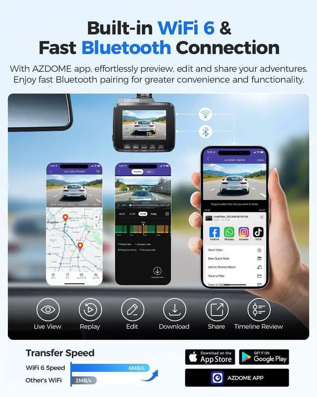 • WiFi 6 & App Control: Dash cam with built-in WiFi 6, you can quickly view and download videos directly to your phone. This dashcam saves you from the hassle of removing the memory card by enabling seamless wireless file transfers.