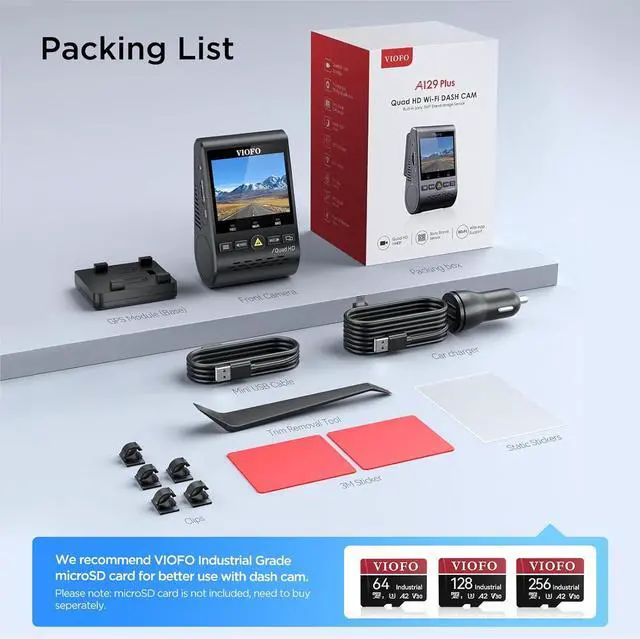 Optional Memory Card Recommendation VIOFO industrial high endurance microSD cards, optimized for dashcam recording, give greater assurances around compatibility and long-life durability, greatly elevating your dashcam owner experience. There are different options for your choice: 64GB/128GB/256GB.