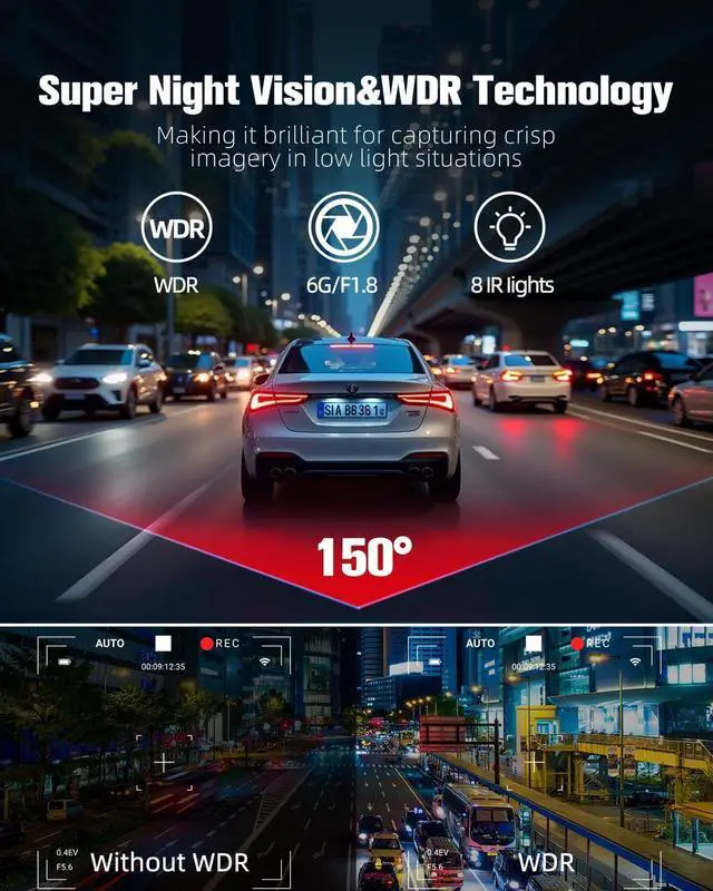 Super Night Vision See Darkness DifferentlyOutshine competitors with WDR tec, F 1.8 aperture and 6-glass lenscapture license plates in pitch-black alleys or blinding highway glare. The infrared interior cam uses IR LEDs to record in darkness, while WDR Pro tech tames LED headlight halos for crystal-clear front footage.