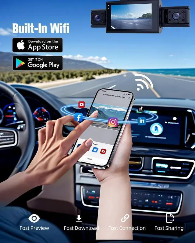 Built-in WiFi Evidence at Your FingertipsDownload 4-ch recordings 3x faster than standard dash cams. It pairs with a free app for Android or iOS, enabling seamless control, video preview, download, and sharing. Includes a free 64GB endurance card (supports 256GB)