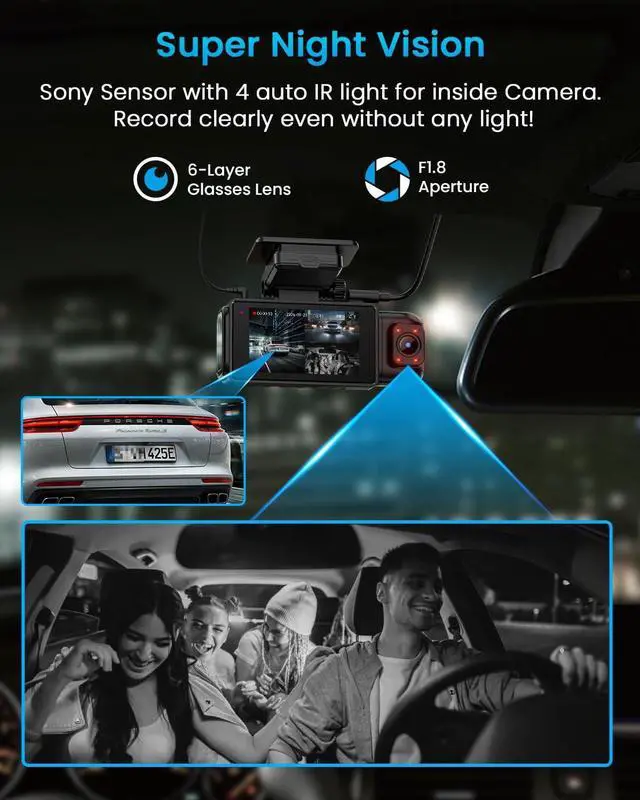 Peregrine Falcon Night Vision & Rotatable Right LensThe front camera uses Sonys STARVIS sensor, along with HDR and WDR technology, to capture clear video even in low-light conditions. The rotatable inside camera features 4 IR lights for black-and-white night vision, ideal for a side camera for car setup or as an Uber camera inside car. The rear camera records in 1080P, offering reliable evidence collection in all scenarios.