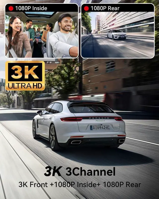 3-Channel Dash Cam with 3K+1080P+1080PThis 3 channel dash cam features an industry-leading SONY IMX sensor and processor, delivering smooth, high-definition video. With simultaneous 3-channel recording, it offers 3K (2880x1620) front, 1080P (1920x1080) inside, and 1080P (1920x1080) rear resolution for comprehensive protection. The 170° wide-angle front, 150° inside, and 170° rear cameras eliminate blind spots, ensuring full coverage. Perfect dash cam front and rear inside 24/7 recording.