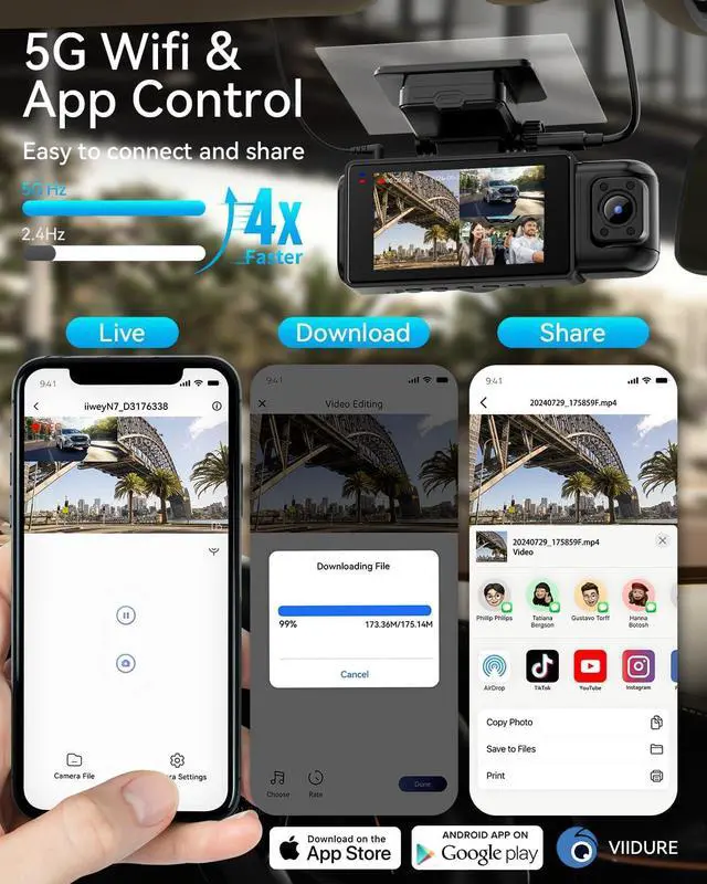 5G WiFi & Easy Phone ConnectionEnjoy high-speed 5G WiFi for ultra-fast downloads, reaching speeds up to 8MB/s (compared to just 2MB/s with 2.4GH z WiFi). Stream live video from your dash camera for cars seamlessly on your phone, adjust camera settings, download footage, and share videos effortlessly on platforms like Instagram, YouTube, and Facebook. You can use the app free and not recomment to pay the subscription fee.