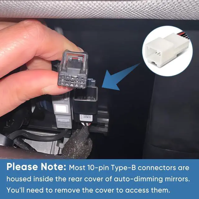 Not All 10-Pin Connectors Are the Same Compatible only with auto-dimming rearview mirrors featuring a Type B 10-pin power connector. Confirm mirror type and connector via our compatibility chart before purchase. Other 10-pin connectors (Type E, H, etc. ) may look alike but have different pin layouts and power configurations. This adapter supports Type B onlydo not rely on connector shape alone for compatibility.
