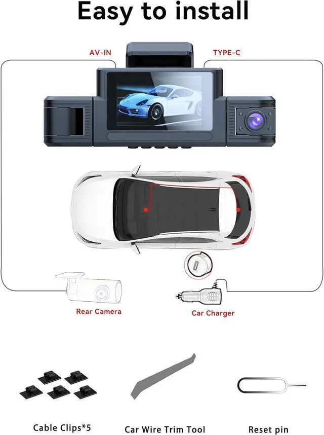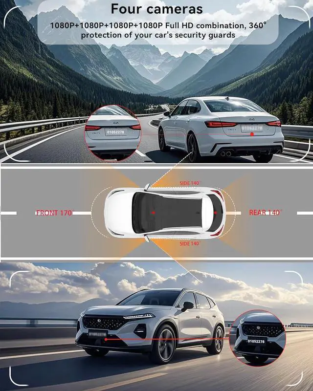 4-Channel Dash CamThis dash cam features a 3-inch IPS screen and supports FHD 1080P+1080P+1080P+1080P resolution, enabling 360° all-around recording, including front, rear, side, and interior views. Additionally, it offers a 2K+1080P+1080P+720P mode to accommodate diverse needs. Furthermore, the N5 is equipped with 170° ultra-wide-angle front and rear cameras and 150° wide-angle side cameras, providing a broad field of view to capture every detail of the road.