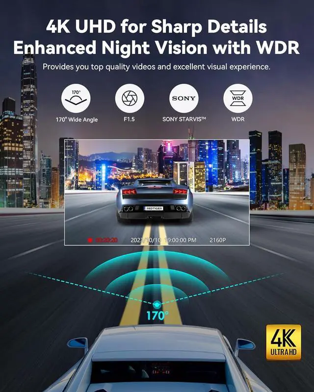 WiFi/Smart Phone APP-The 4K dashcams has built-in Wi-Fi with easy connection to your smartphone app. With the" Redtiger" app, it' s very convenient to operate live preview, playback, and device management on your smart phone. what' s more, Video files can be downloaded to smartphone and shared with your friend by social media.