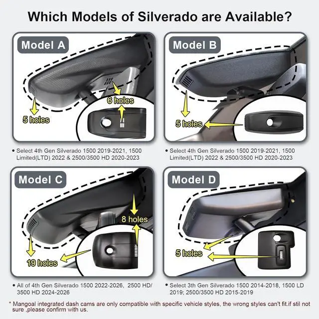 Custom fit for Chevrolet SilveradoMangoal 4k dash cam can fit perfectly behind the rear view mirror like original. No messy wiring exposed, no complicated rewire at all. Perfectly intergrated with Chevrolet Silverado 1500 2022-2026, 2500 HD/3500 HD 2024 2025 2026 vehicle styles, Such as WT, LT, RST, Costom Trail Boss, LTZ, LT Trail Boss, High Country, ZR2. (Model C), Not suitable for Silverado EV