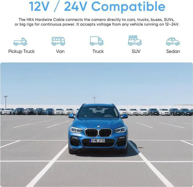 12 / 24V CompatibleHK4 ACC Hardwire kits connects the camera directly to the car, truck, bus, SUVs, or big rig for continuous power, accepts voltage from any type of vehicles runs on 12 24V.