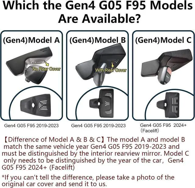 Difference of Model A & B & CThe model A and model B match the same vehicle year Gen4 G05 F95 2019-2023 and must be distinguished by the interior rearview mirror. Model C only needs to be distinguished by the year of the carGen4 G05 F95 2024+ (Facelift)