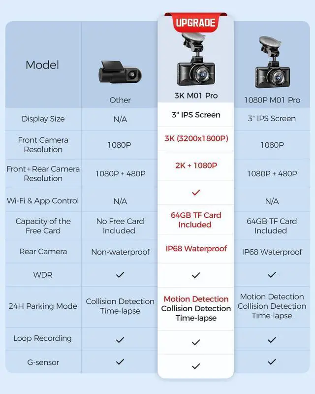 Free 64GB Card & Loop Recording: M01 Pro car camera won' t lose any crucial evidence with loop recording function, overwriting the oldest unprotected files when the SD card is about full.
