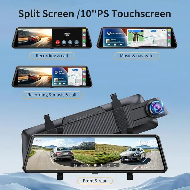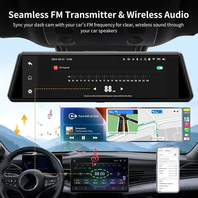 Wireless CarPlay Freedom, Zero Cord ChaosMirror dash cam front and rear syncs CarPlay & Android Auto via 5.8GH z WiFi with lightning-fast responsivenessstream music on desert drives or navigate city traffic seamlessly, while FM transmitter upgrades classic car audio systems without messy wiring