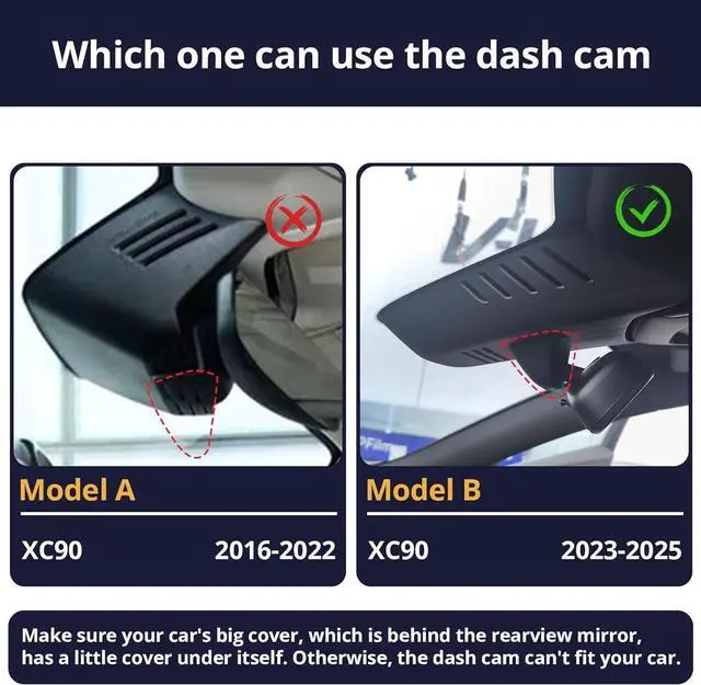 [OEM Style, Exclusively for XC90 2023-2026] The FUVYMYT 4K hidden car camera features an OEM-style design, exclusively customized for Volvo XC90 2023, 2024, 2025 and 2026 models. Please confirm the second picture carefully, the correct vehicle should have a little box behind the rearview mirror. If there is a big cover behind the rearview mirror, the dash cam can' t be installed in your car. Please purchase with caution.