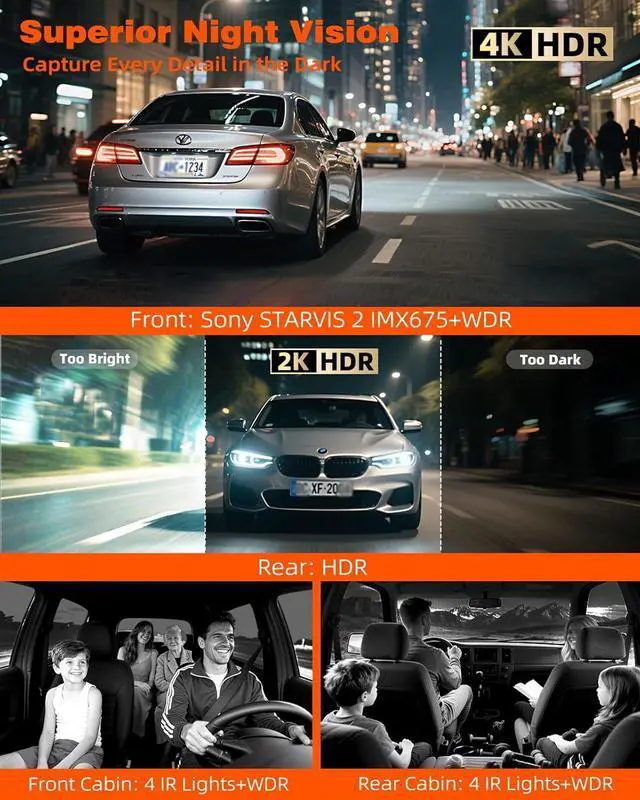 4 IR Sony STARVIS 2 Night Vision for this camera for car: Powered by Sony STARVIS 2 sensor and 4 cabin-dedicated IR lights, the F 1.55 aperture with WDR technology in this dash cam delivers razor-sharp footage in pitch-black or backlit scenes, enabling 24/7 professional-grade monitoring of passengers, pets, and road details a key advantage for any reliable car camera dash cam front and rear.