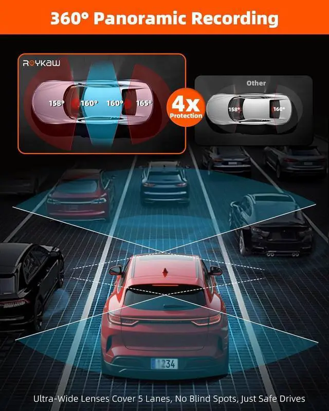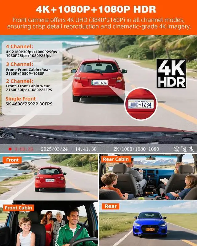 4K 4-Channel 360° All-Around Recording 4 channel dash cam: This dash cam features a 4-channel system for full coverage 4K 2160P front camera plus three 1080P auxiliary cams, a complete dash cam front and rear solution with extra coverage. Its 158° front, 160° cabin and 165° rear lenses eliminate blind spots, ensuring clear license plates and comprehensive road monitoring.