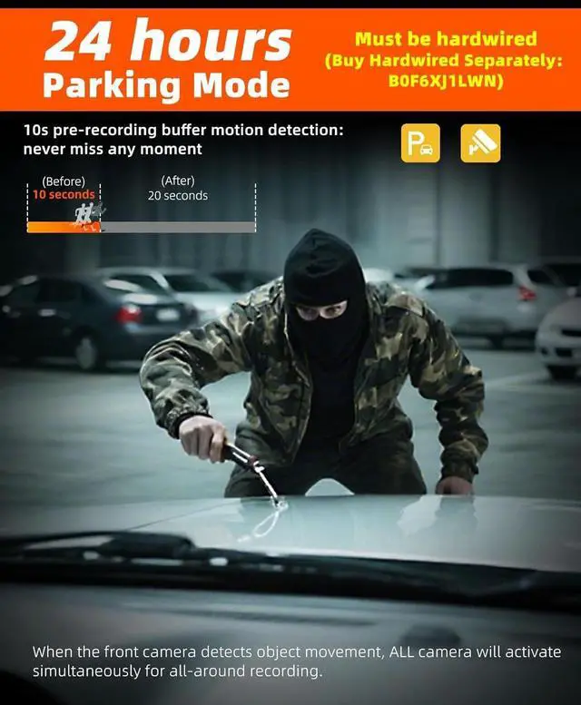 Note: Parking mode requires separate hardwired kit (ASIN: B0F6XJ1LWN) for 24-hour monitoring.