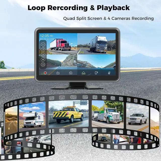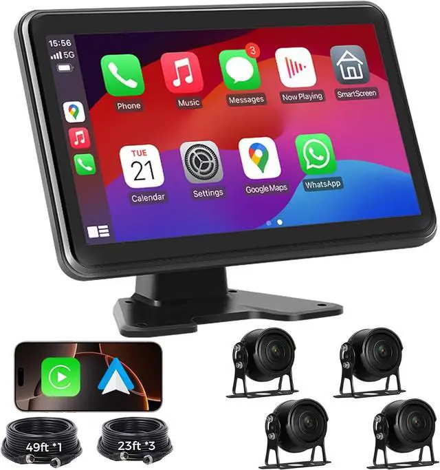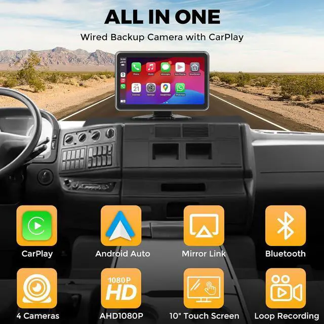 All-in-One CarPlay with Backup Camera SystemGet ready for a whole new driving experience with this amazing CarPlay screen back up camera systems for trucks, RVs! CarPlay & Android Auto, AirPlay & Cast! The smartphone connects to the 10-inch HD full touch screen to enjoy real-time navigation, music, and video via Bluetooth or radio connection to the car stereo. With a 4 dash cameras for truck RV that focuses on improving driving safety, this is the ultimate driving experience!