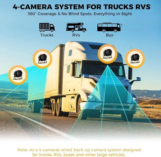 4 Dash Cam Truck RV Camera SystemThis incredible 10-inch wired backup camera with monitor is truly amazing! It' s got a quad camera backup system with 4 HD1080P dash cameras, you' ll have a full-body 4-camera back up camera for trucks, RVs, trailers and more. Get all-around protection! Parking lines, recording and playback (includes 64GB SD card ), mirror image!