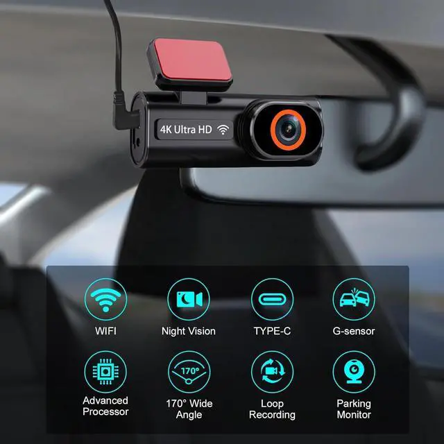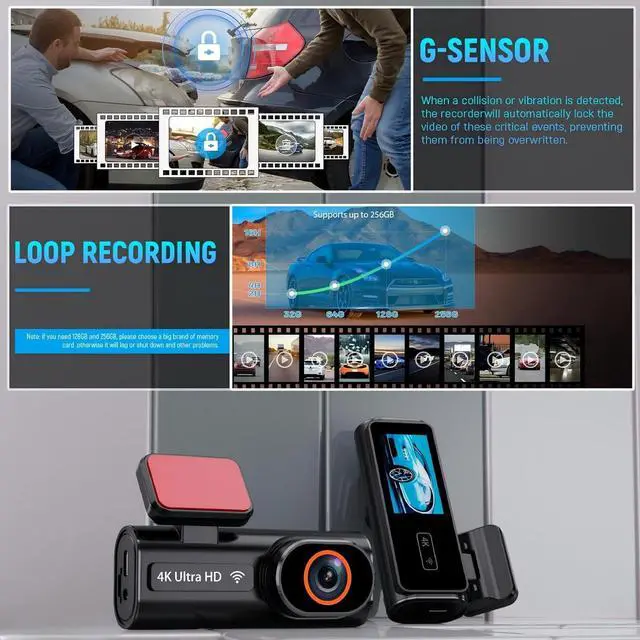 4K+1080P Dual Lens SystemFront 4K lens captures ultra-clear road details (170°coverage), while rear 1080P cam monitors traffic behind (150°view). Dual wide-angle recording eliminates blind spots license plates and lane changes stay visible in sharp focus, day or night.