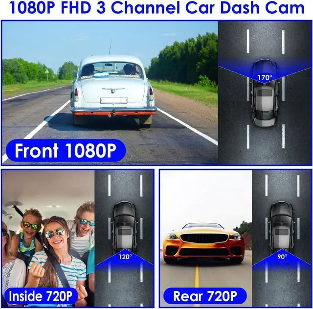 Channels FHD Dash Cam: Come with 1080P FHD front camera with wide 170° angle, 720P inside camera with 120° angle and 720P rear camera with 90° angle, our 3-channel car dash cam provides full vision coverage of your car. The front camera delivers clear and sharp video while rear camera always keeps you well informed of the road status behind. Moreover, picture-in-picture display simultaneously helps capture and retain evidence inside and in front of the car in unexpected collision.