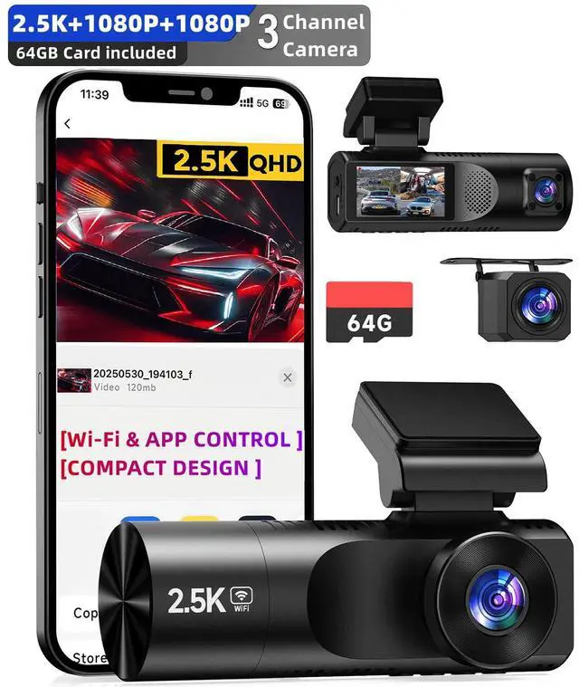FFN Dash Cam, 3 Channel Dash Camera for Cars,2.5K+1080P+1080P Dash Cam Front and Rear Inside,Triple Car Dash Camera with WiFi & App,64GB Card, Night Vision, 24H Parking, G-Sensor, Loop Recording, WDR