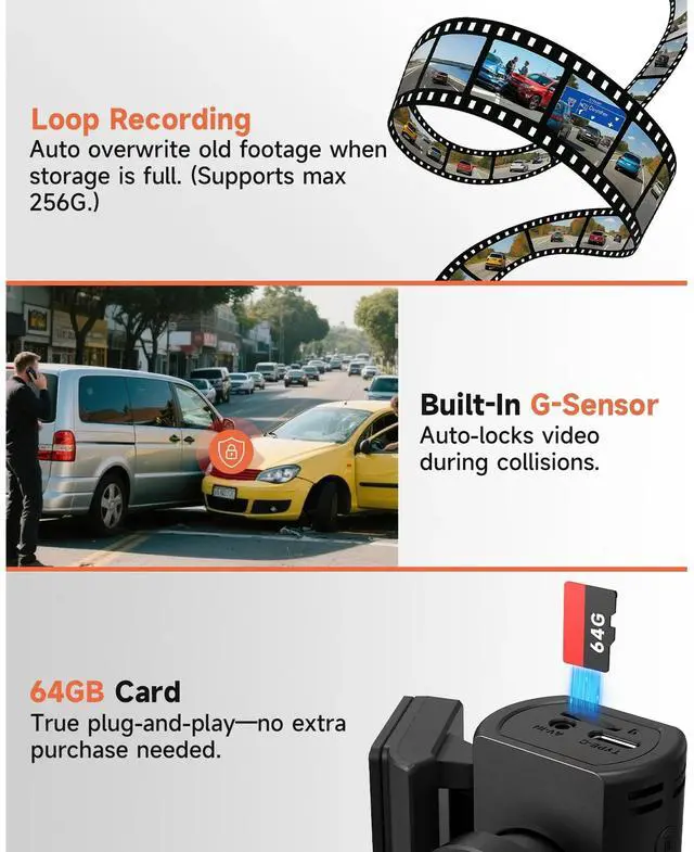 Included 64GB SD Card: Comes ready to use with a free 64GB card and supports loop recording, ensuring you never run out of space. Upgrade up to 256GB (not included) for longer footage storage.