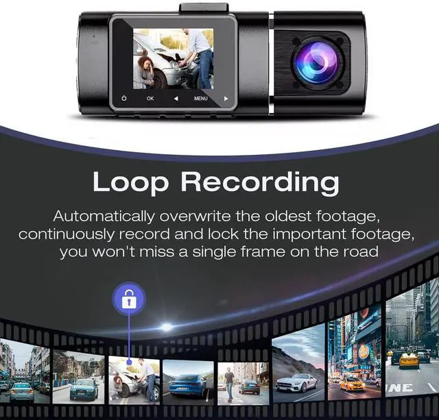 Loop Recording & G-sensor Continuous loop recording will automatically overwrite the oldest footage, so you don't need to worry about your memory card running out of space. Combined with G-sensor (built-in acceleration collision sensor), the dash cam front and inside will lock the footage to prevent the video from being overwritten when it detects a sudden shake/collision, which can be used as evidence an