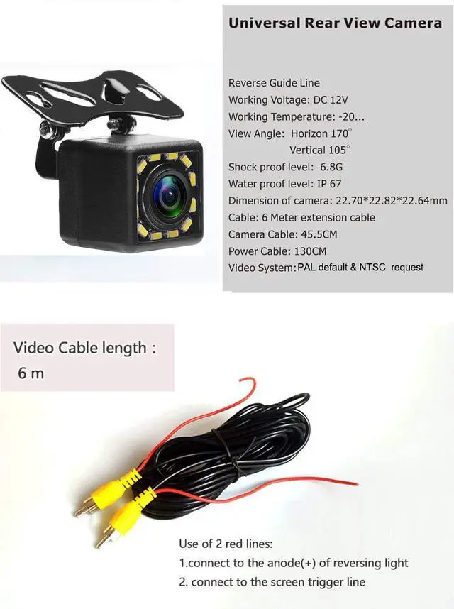 Power supply: DC 12V - video cable connection. A wide camera lens viewing angle ensures that you can see enough to park and reverse safely.