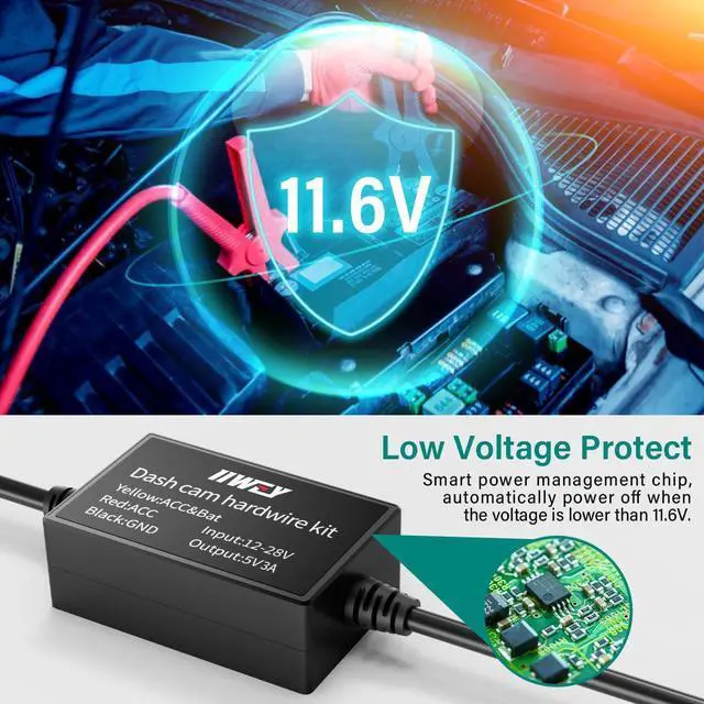 Low Voltage Protection - Built-in sensitive power management chip, once the voltage is lower than 11.6V, it will cut off the power supply to dash cam, leaving enough power to ignite the engine.