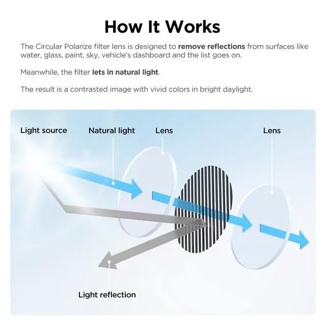 Reduce reflections and glare from glass, metals, or shiny surfaces, enhancing image quality, similar to polarized sunglasses.