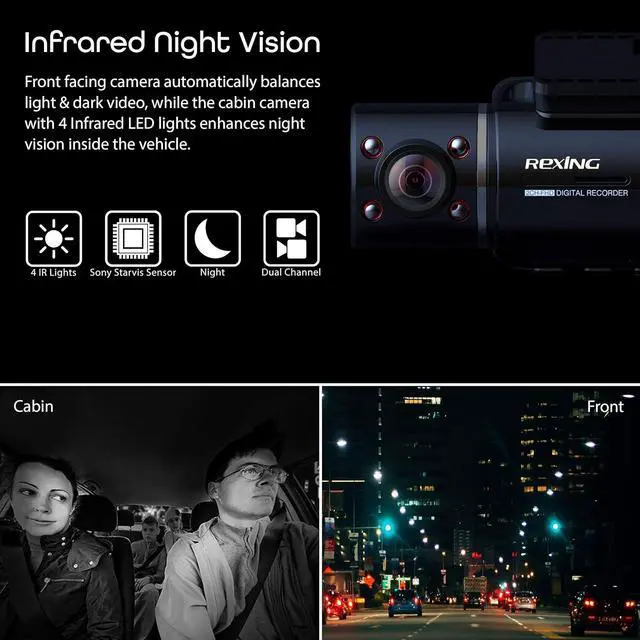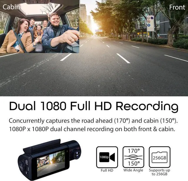FULL HD DUAL CHANNEL RECORDING: Front and cabin (inside-facing) cameras each record 1080p video @ 30fps. 170 DEGREE ULTRA WIDE ANGLE LENSES on both cameras open up to capture sweeping views of their surroundings.