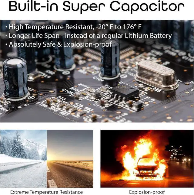SUPERCAPACITOR & PARKING MONITOR: Power is delivered with the help of a supercapacitor, a premium alternative to a lithium-ion battery which features an enhanced temperature resistance to hot and cold climates. With the parking monitor feature, the dash camera will automatically turn on and record when the car camera detects vibration OR dash cam will capture frames for a time lapse video for 24/7. Please connect the smart hardwire kit to activate the parking mode.