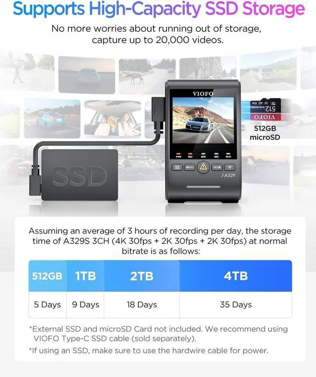 [Support Up to 4TB SSD or 512GB microSD] Say goodbye to storage limitations! The A329S supports external SSDs up to 4TB or microSD cards up to 512GB, allowing for uninterrupted recording for over 3 weeks. Perfect for long road trips without constant overwriting worries. We recommend using the optional VIOFO Type-C SSD cable. (*Note: microSD card and SSD storage are not included. )