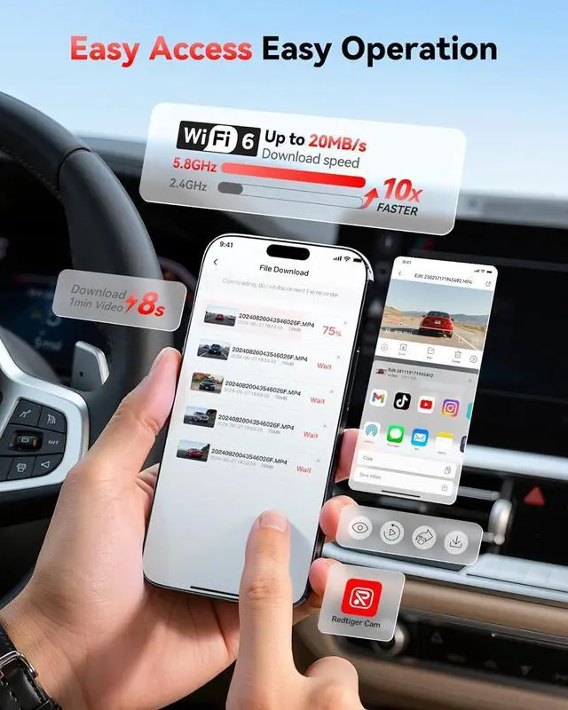 [Built-in 5.8GH z WiFi & Smart App] Connect your smartphone to the dashcams built-in 5.8GH z WiFi to enjoy ultra-fast downloads up to 20MB/s. Using Redtiger Cam app, you can preview, download, and replay videos in real time, check GPS ata (route, speed, and location), and manage settings effortlessly, making it simple to review footage and share important moments.